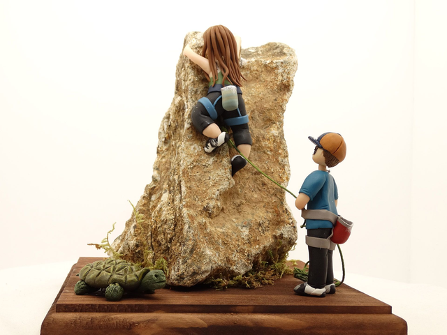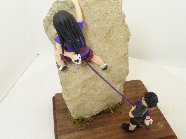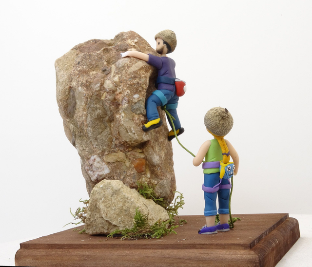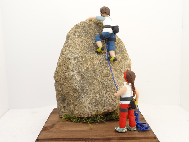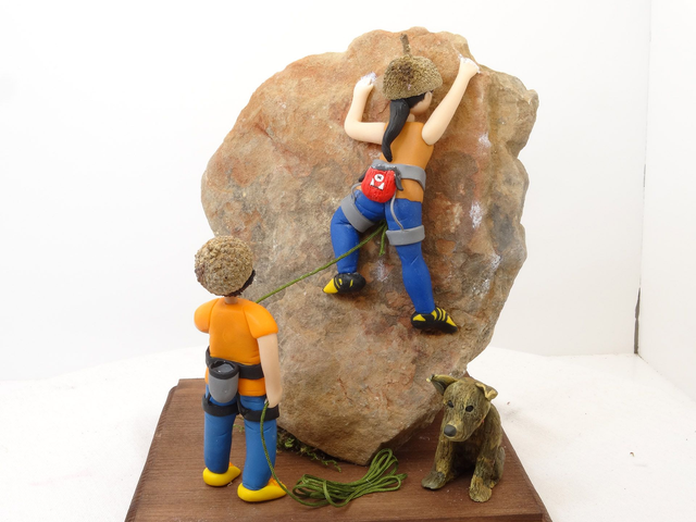It represents a sport climbing scene with rope: a climber on the rock and a belayer on a wooden base.